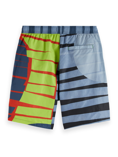 Mid-length printed swim shorts, featuring a bold print and an adjustable waistband for a comfortable, customised fit.