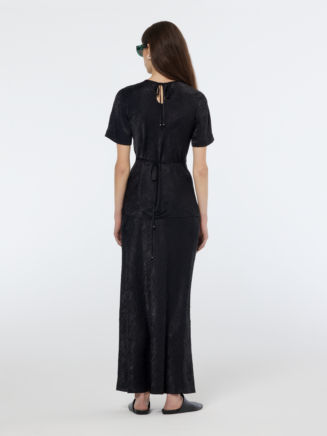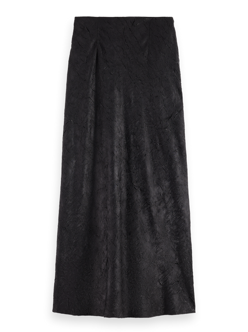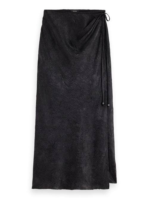 This maxi wrap skirt showcases a draped fit, perfect for pairing with its counterpart, the Crushed Satin Wrap Top. Together, they create an effortlessly elegant ensemble.