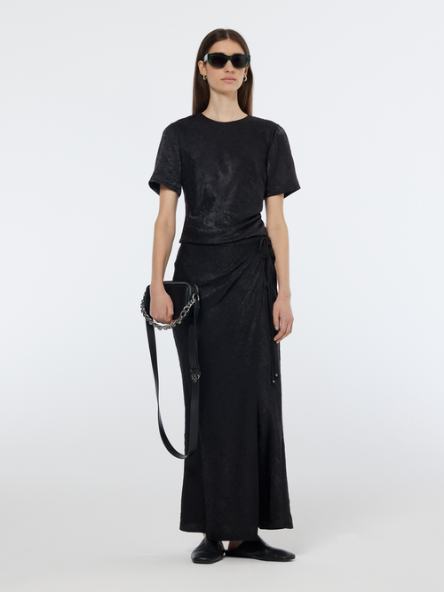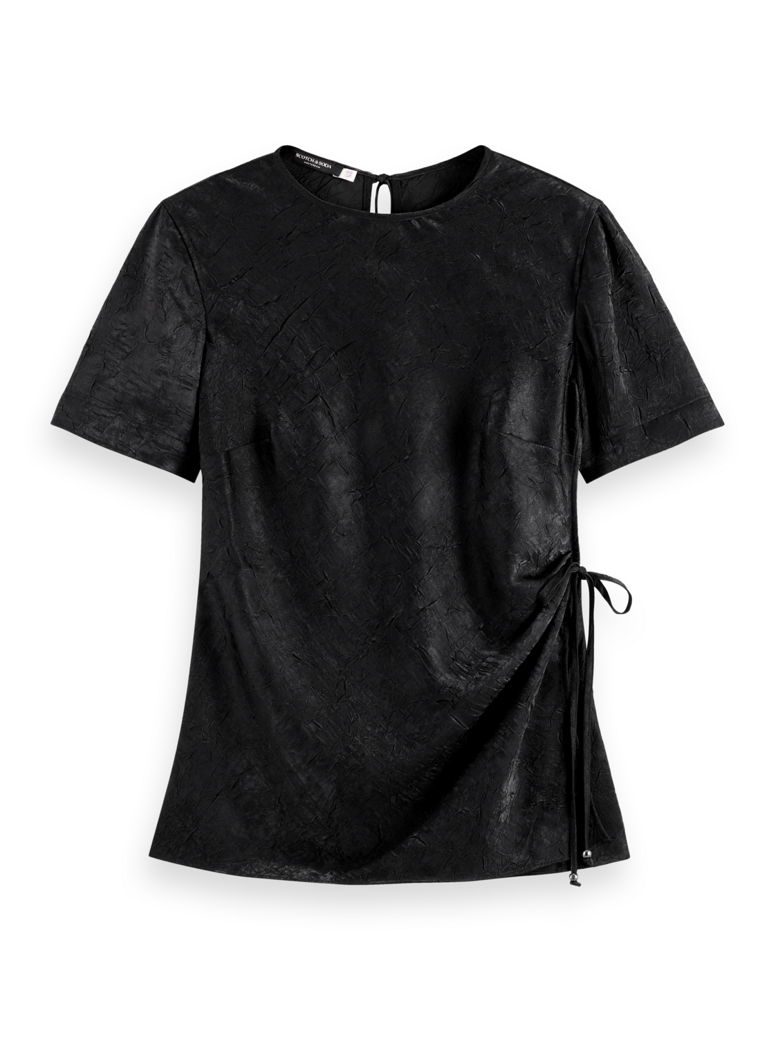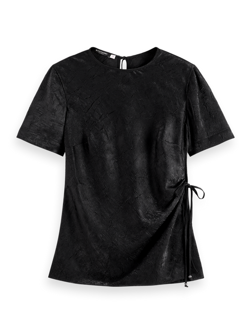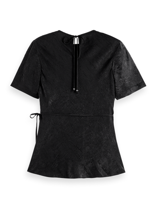 Crafted with a jewel neckline and short sleeves, this wrap top is accentuated with a cinched waist, offering a luxurious and flattering look thanks to its crushed satin fabric.