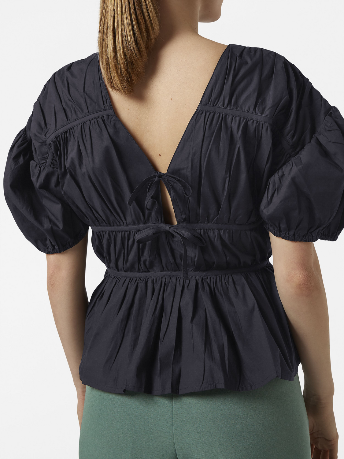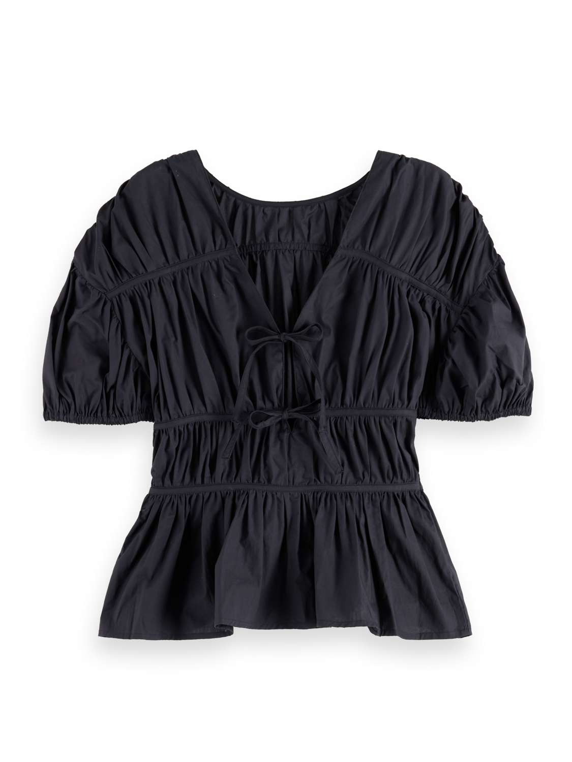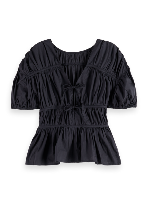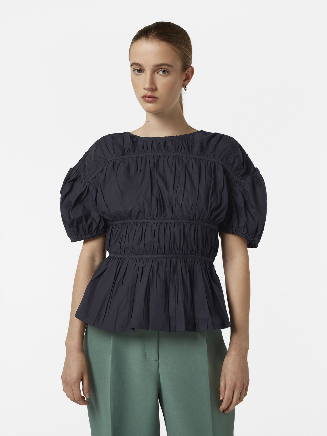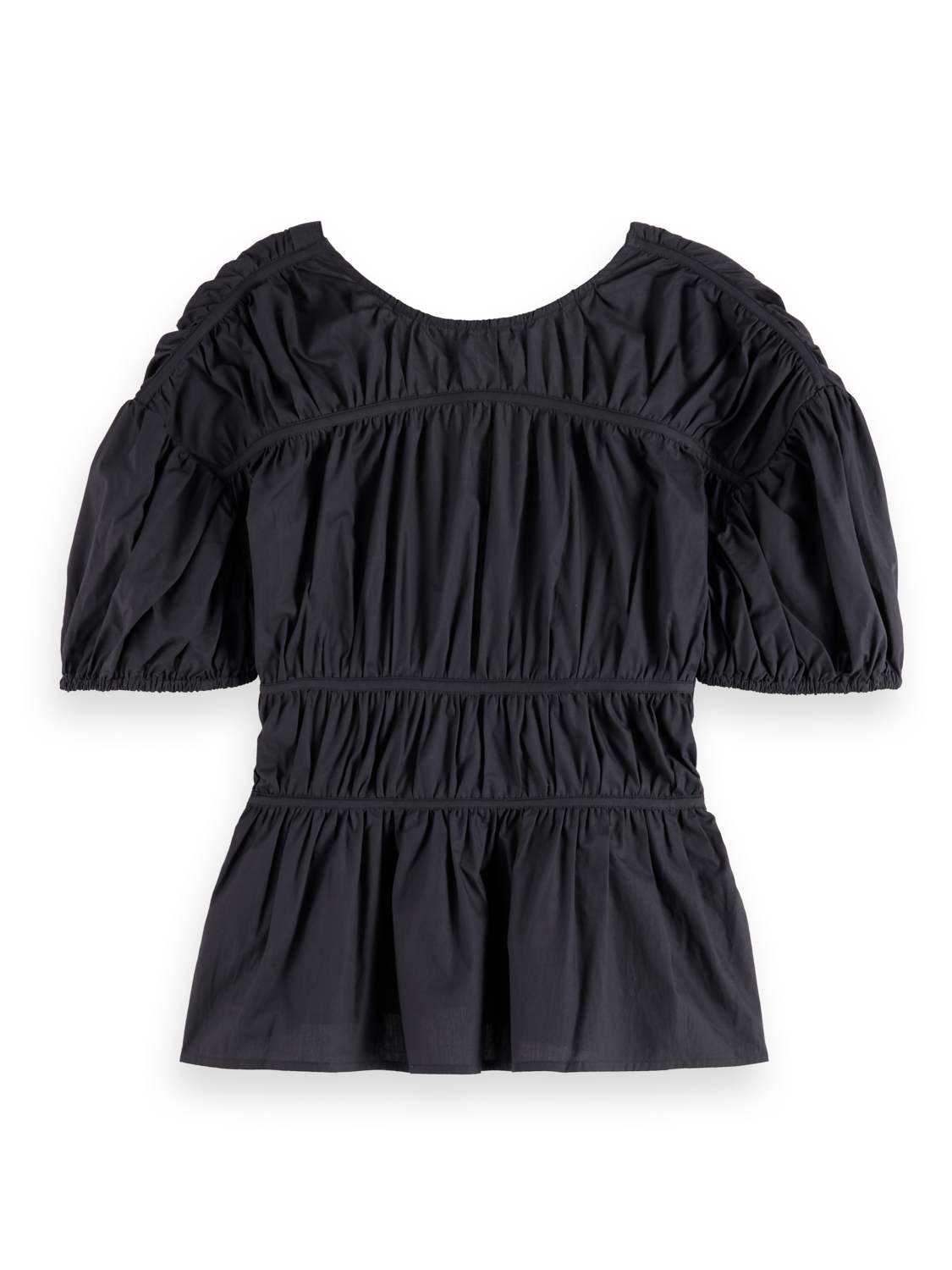 Embrace soft femininity with this gathered cotton top, featuring ruched detailing and puff short sleeves. The round neckline complements its playful silhouette, making it a versatile piece for everyday elegance.