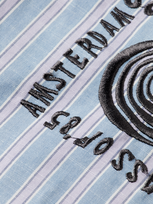 A classic oxford shirt reimagined with bold patchwork and striking stripes, adding a contemporary twist to timeless style.