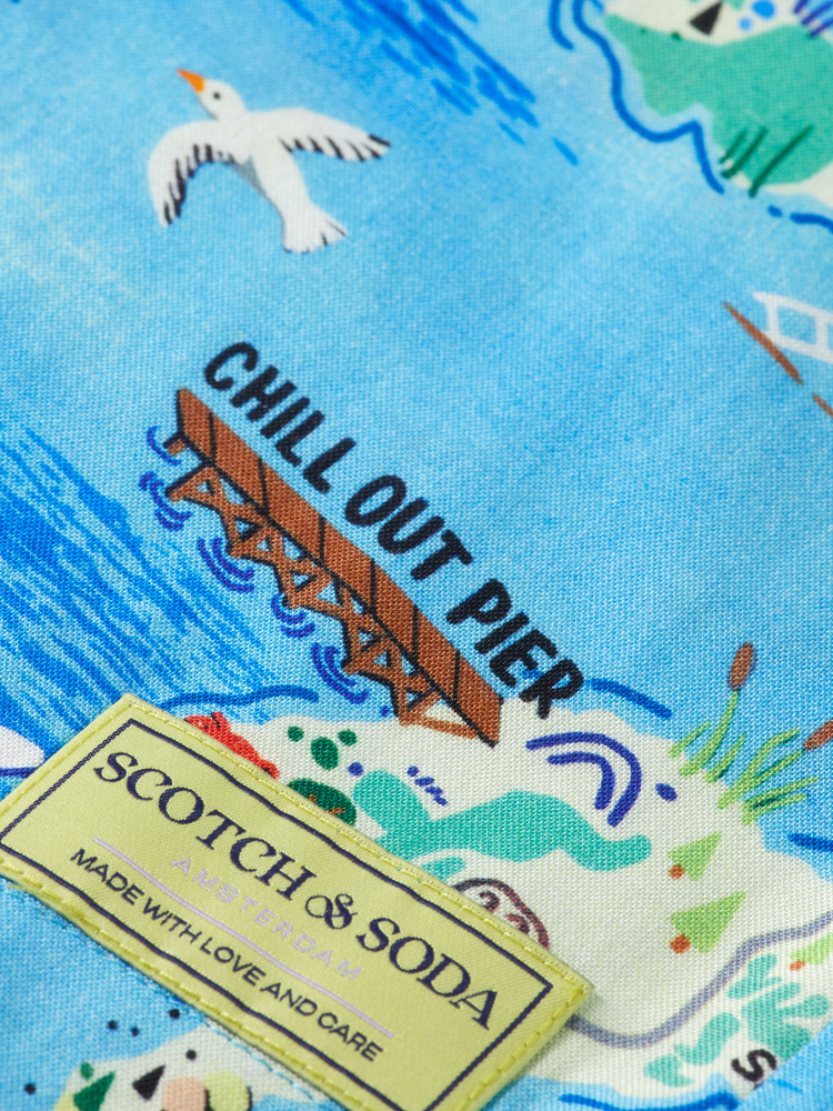 The All-Over Printed Short-Sleeved Viscose Shirt adds a playful twist to any occasion, showcasing laidback luxury and vibrant patterns.