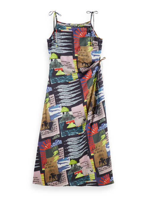 This collage-inspired midi dress features adjustable straps and a ruched waist letting you customize the fit.