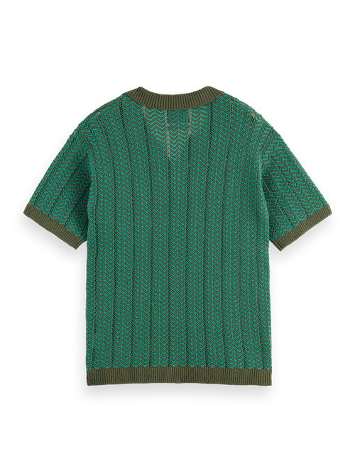A modern interpretation of knitwear, this open-textured polo features a refined v-neck and a breathable, lightweight feel.