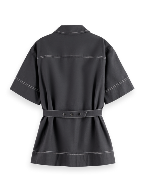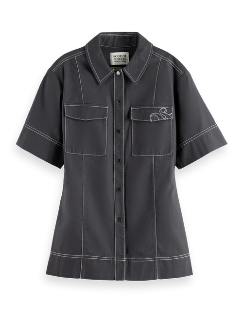 An elevated classic, this structured short-sleeve denim shirt is nipped at the waist for a more polished look.
