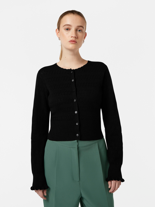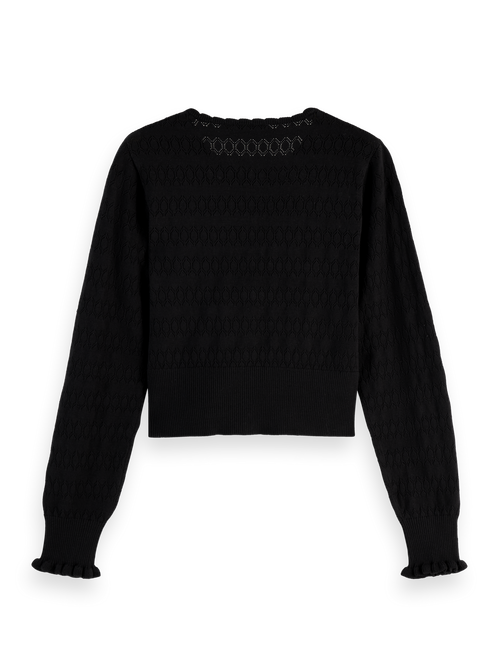 This button-down cardigan, with its detailed pointelle stitch and scalloped edges, offers a subtle charm to any outfit, perfect for changing seasons.