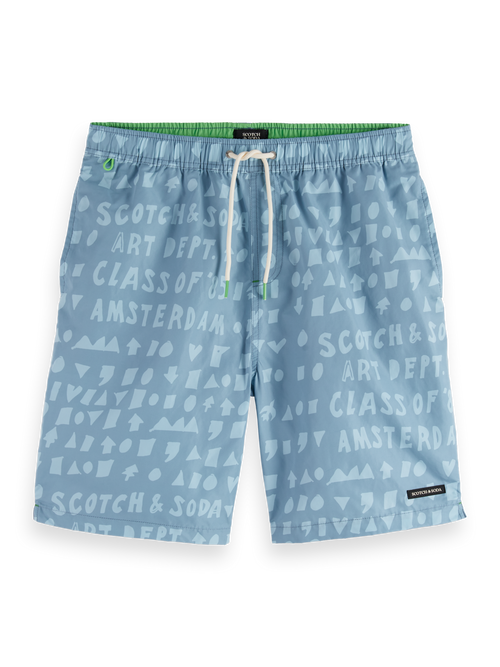 Mid-length printed swim shorts, featuring a bold print and an adjustable waistband for a comfortable, customised fit.