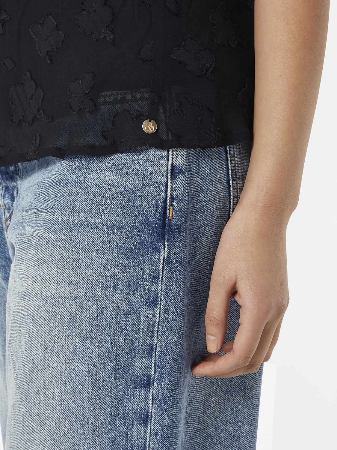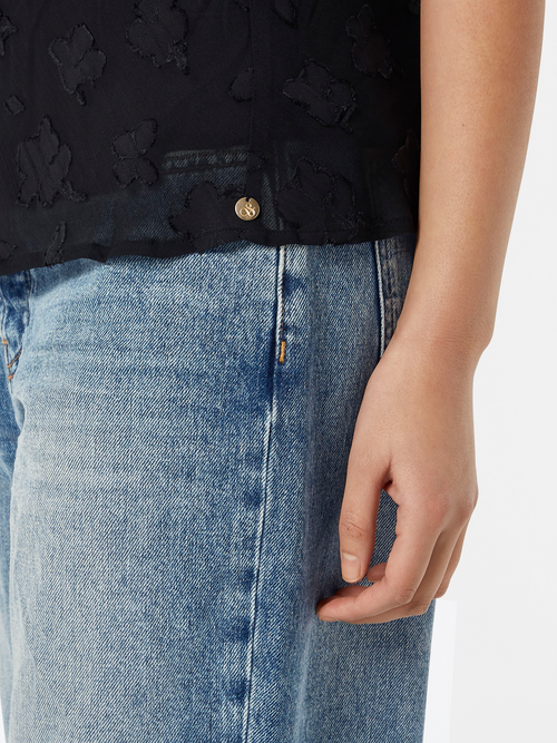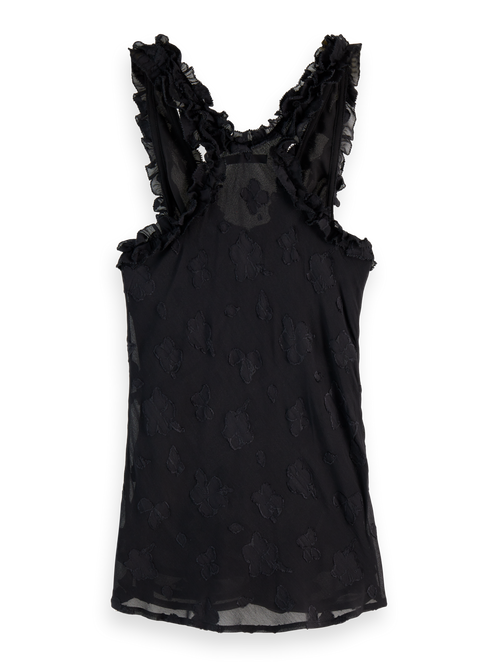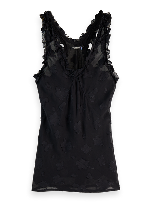 This sheer tank top features ruffle straps and a v-neck design, complemented by a tie bow detail on the front for a feminine touch. Its slimming fit ensures a flattering silhouette.