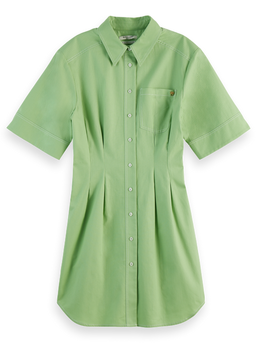 The Mini Shirt Dress reinvents classic stripes with its structured fit, offering a playful yet polished outfit option.