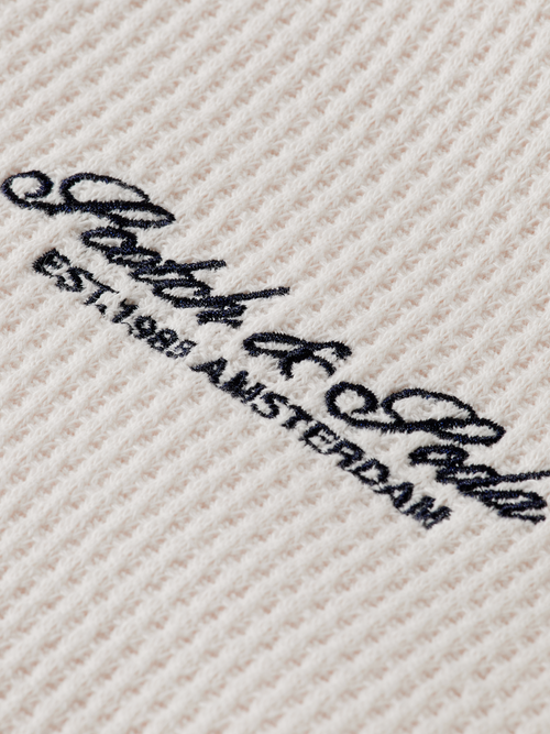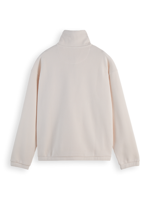 This sweatshirt is characterized by its waffle texture, long sleeves, and high collar with a half-zip closure. Ideal for transitional weather, it offers both warmth and style, serving as a versatile layering piece.