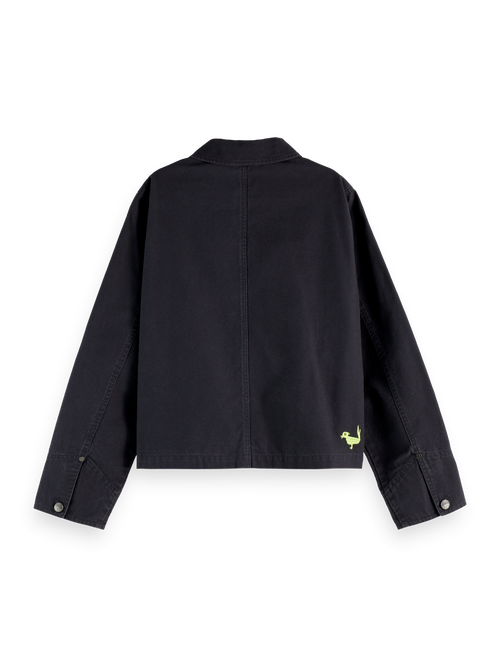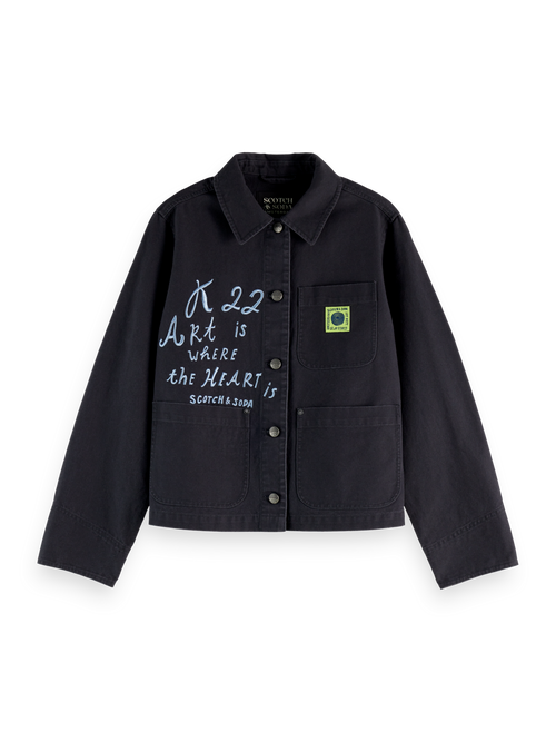 An instant statement piece, this washed-denim workwear jacket features hand-drawn text and an old-school logo.